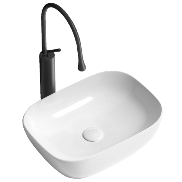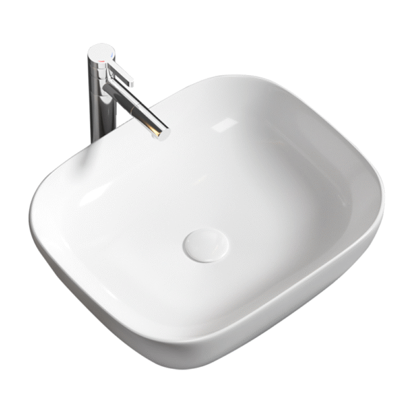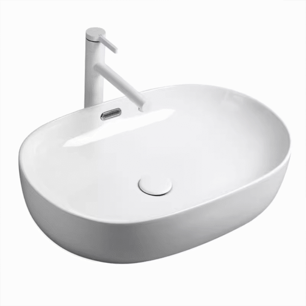 The ceramic washbasin on the bathroom countertop is oval-shaped